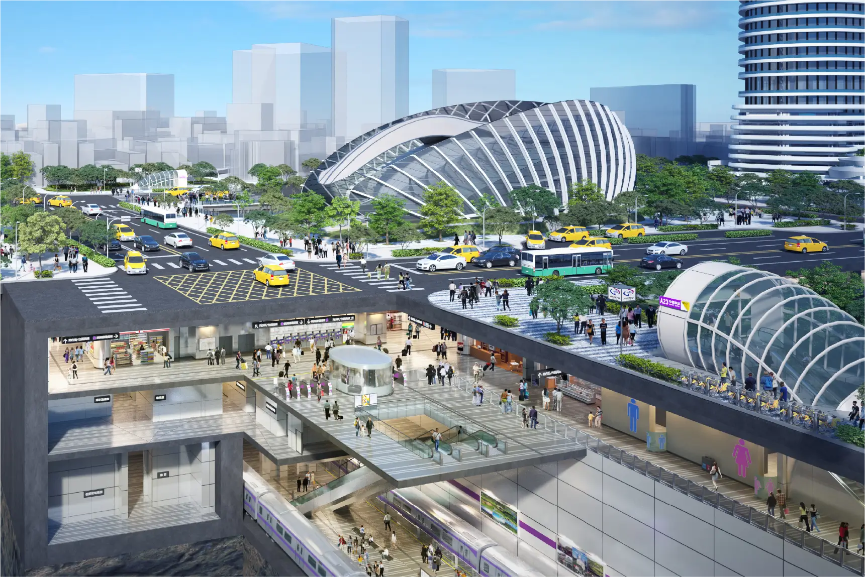 中壢新站三鐵共構,結合火車站與捷運,雙軌並行,機捷通往青埔高鐵與桃園機場,捷運綠線串連八德、桃園、蘆竹、大園區,一線串聯桃園生活圈